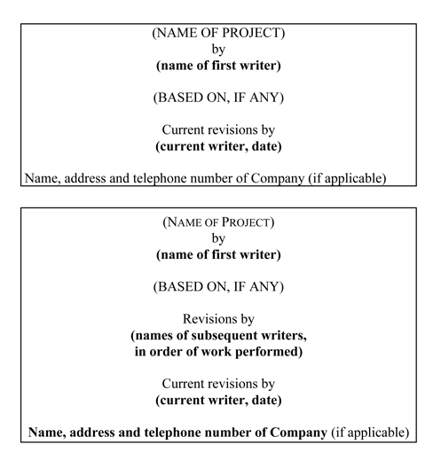 It is crucial that the cover page of each piece of literary material accurately reflects 1) the prior writers on the project and 2) the writer who is responsible for the changes in that specific document (i.e., “current revisions by”), regardless of how insignificant the changes are. Accordingly, do not remove the names of earlier writers, even if you believe that not one word of their material remains in the current draft.