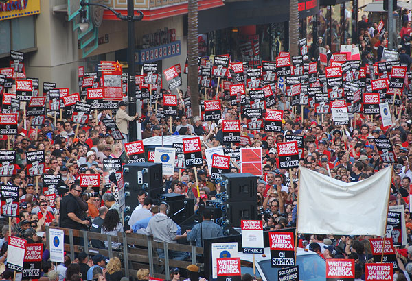 WGA members and supporters rally on Hollywood Blvd. during the 2007 writers’ strike2007-'08 – The Guild struck the AMPTP for 100 days. Gains included MBA coverage of content made for new media; and residuals for reuse on new media platforms, including digital downloads and use on ad-supported internet services.