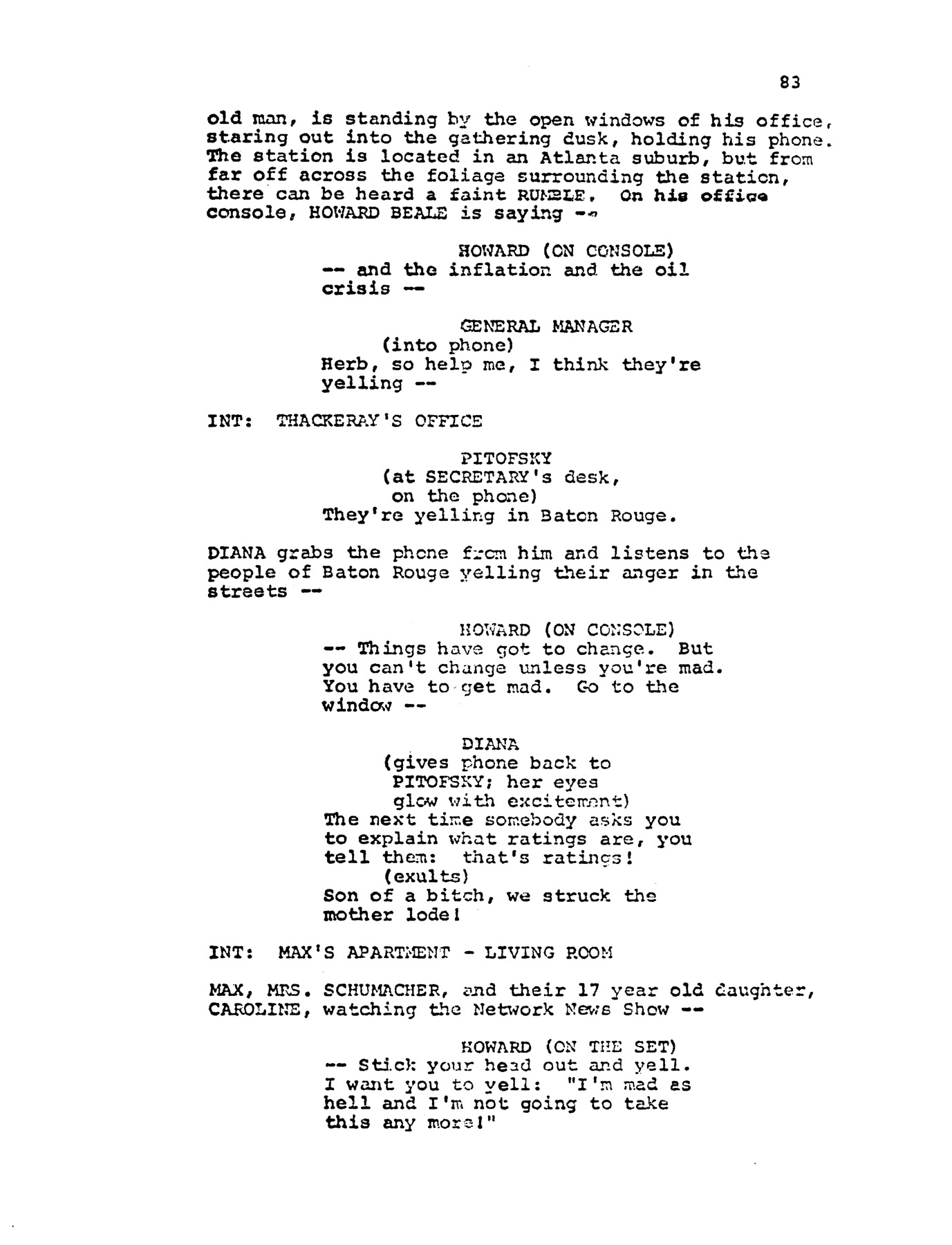 - Chayefsky on the "Mad as Hell" speech: "I wanted everyone, every man, woman or child to realize that they had a choice. I wanted them to know that they have the right to get angry, to get mad. They have the right to say to themselves, to each other, to the world at large, that they had worth, they had value. The speech wrote itself, because that was Beale's battle cry for the people." - Shaun Considine, Mad As Hell: The Life and Work of Paddy Chayefsky